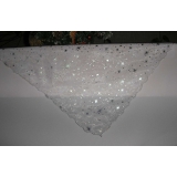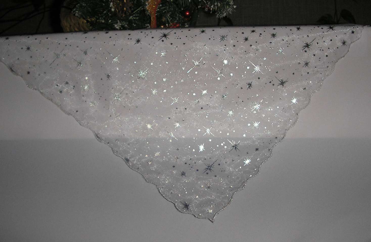 Nabízím krásný ,bílý,vánoční ubrus se stříbrnými hvězdičkami,olemovaný ozdobným stříbrným,vlnkovým vyšitím o rozměru 70/70.Materiál -organza |